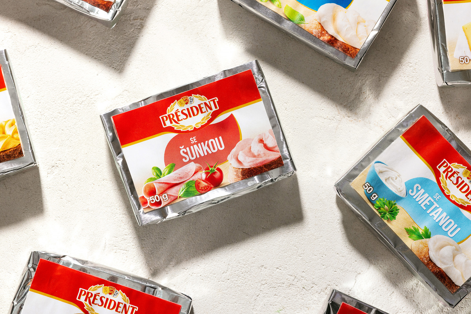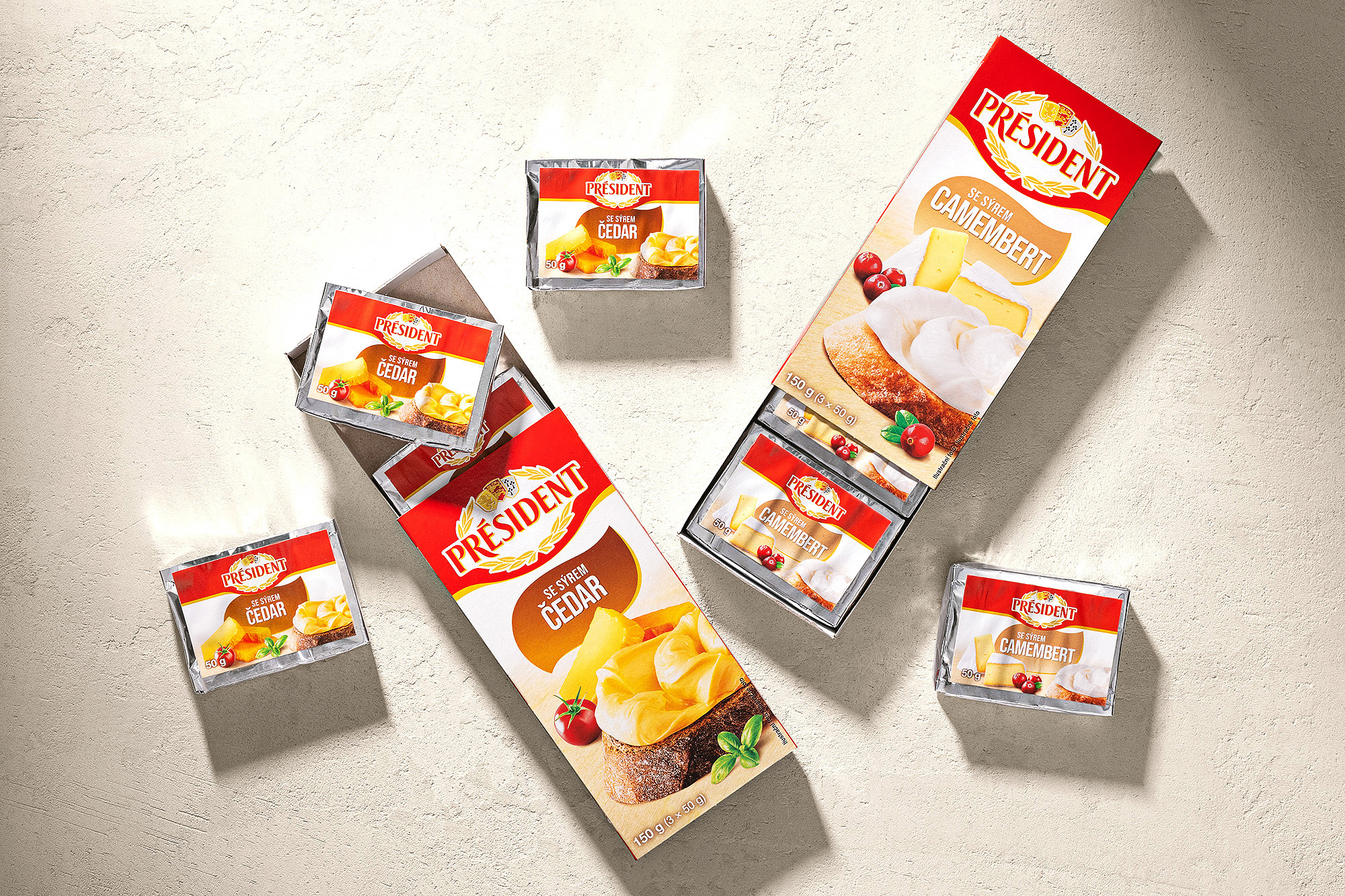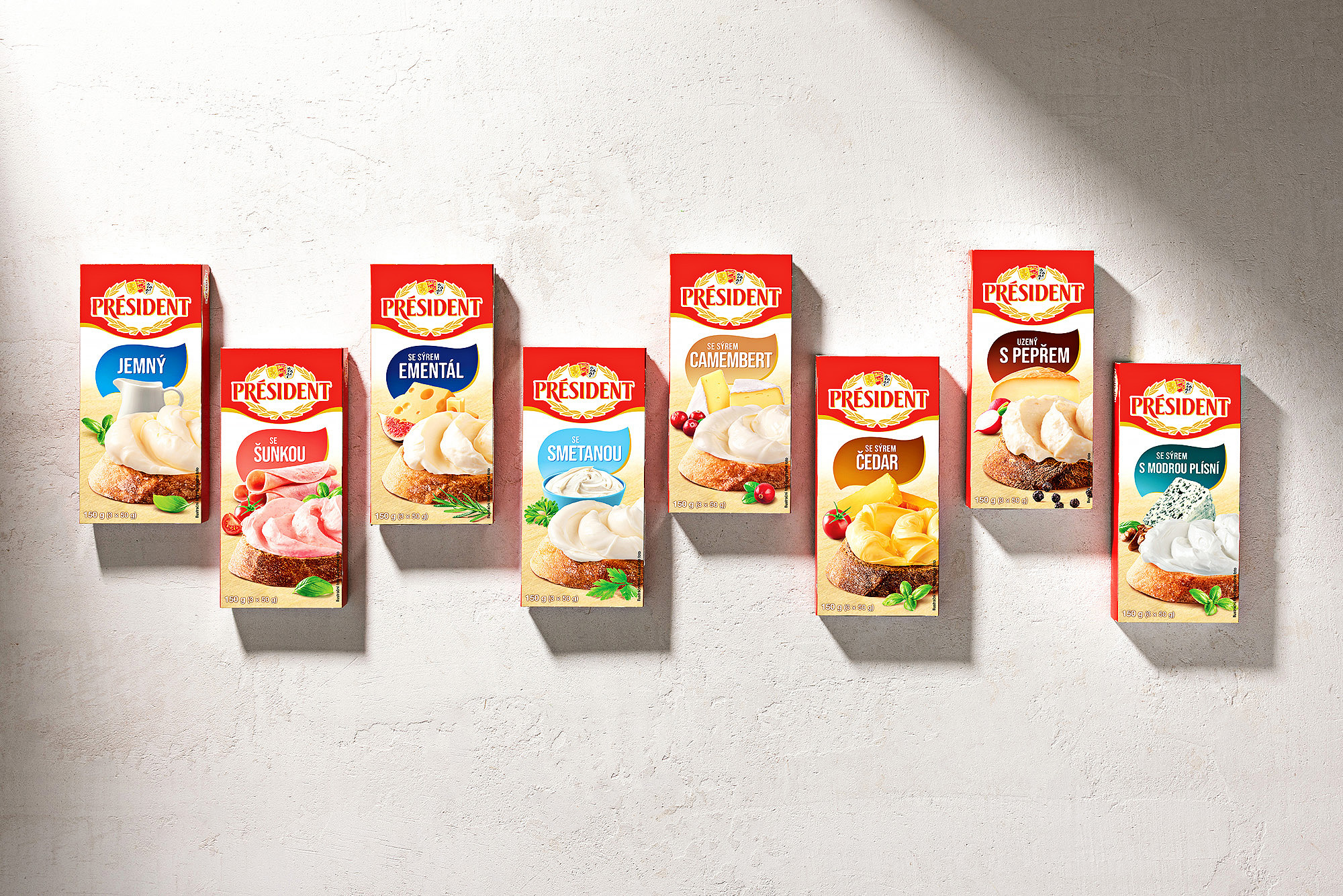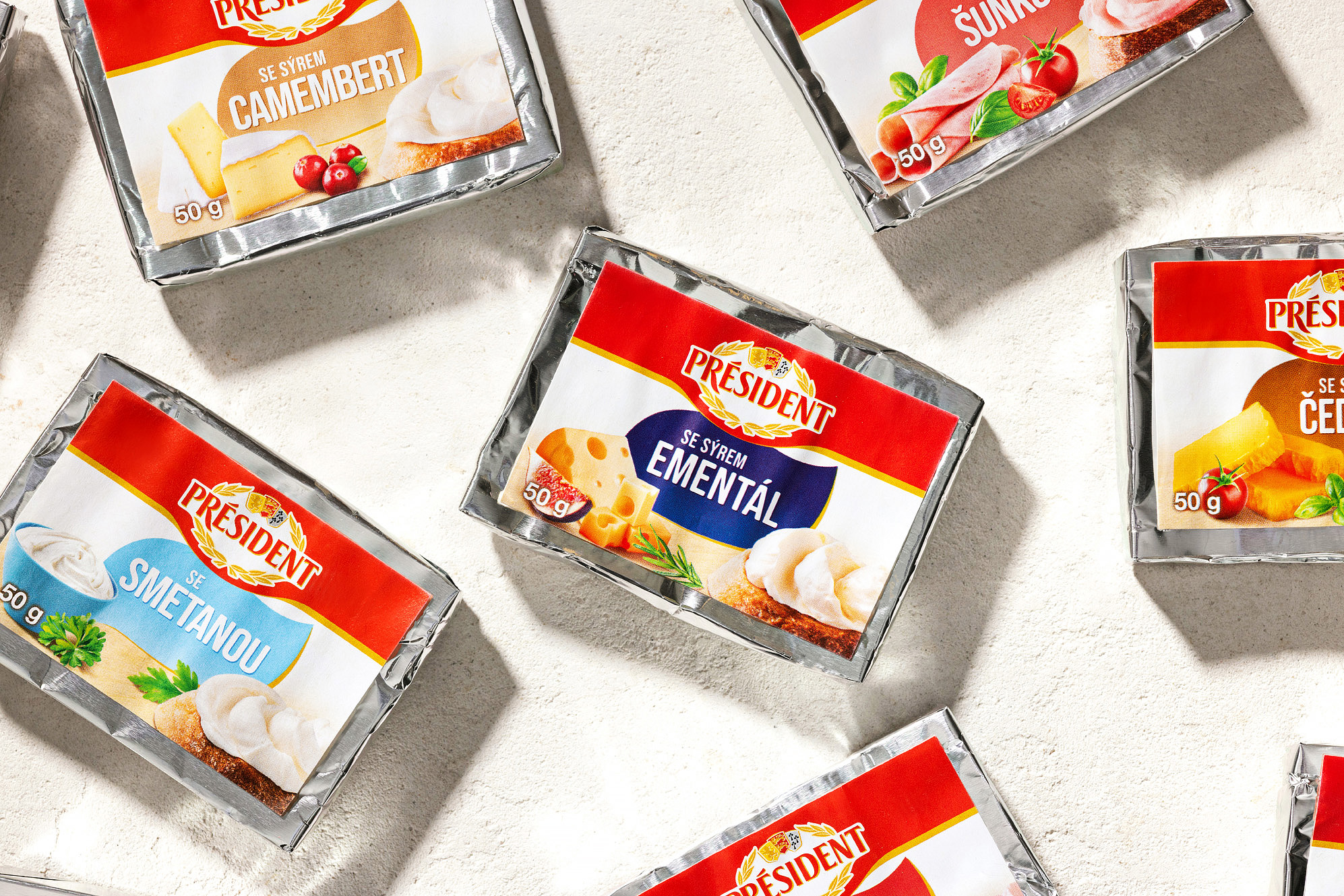 Připravili jsme kompletní vizuální sadu obalů pro řadu tavených sýrů značky Président. Projekt zahrnoval food styling, produktovou fotografii, grafický design a úpravu osmi hlavních designů obalů.