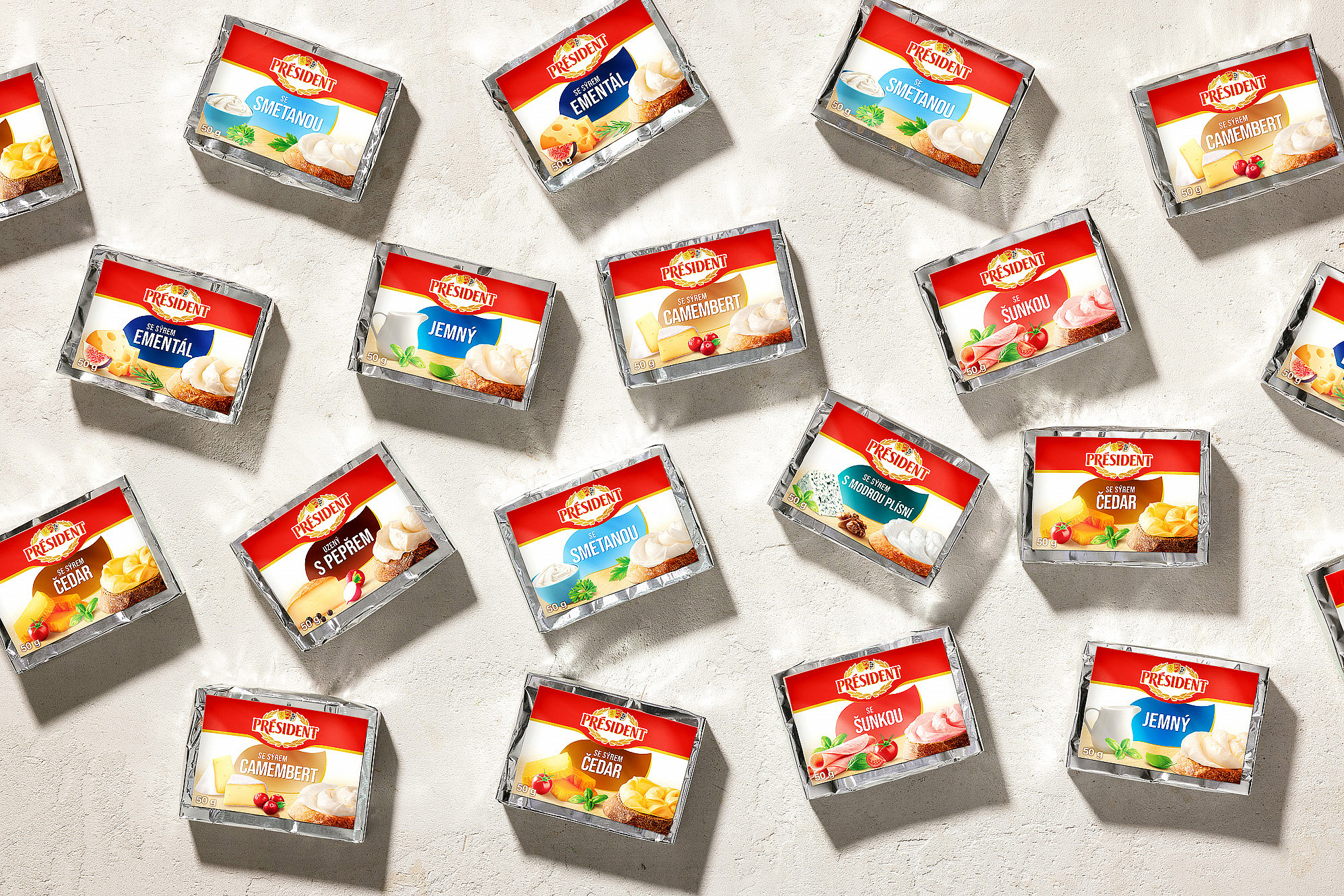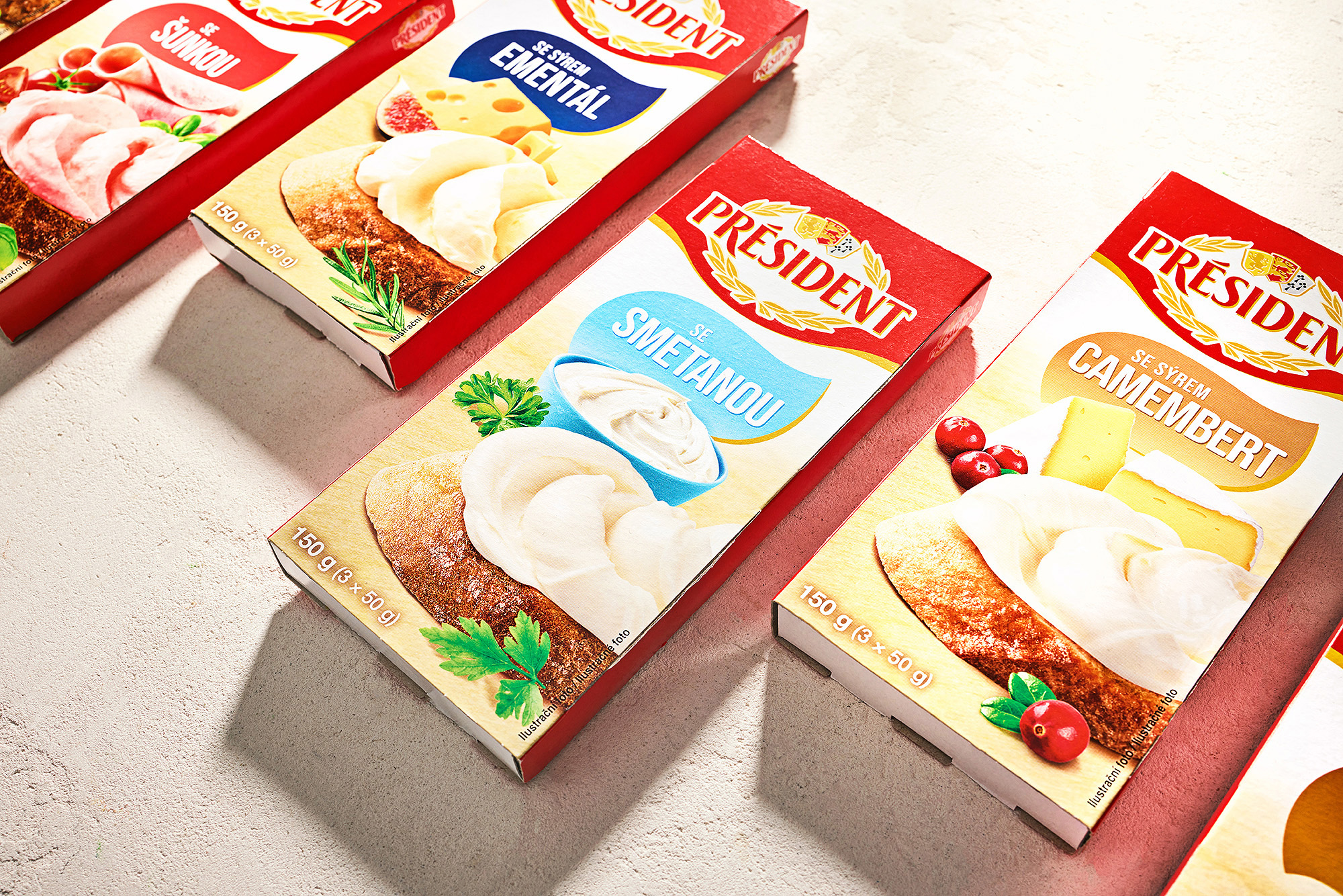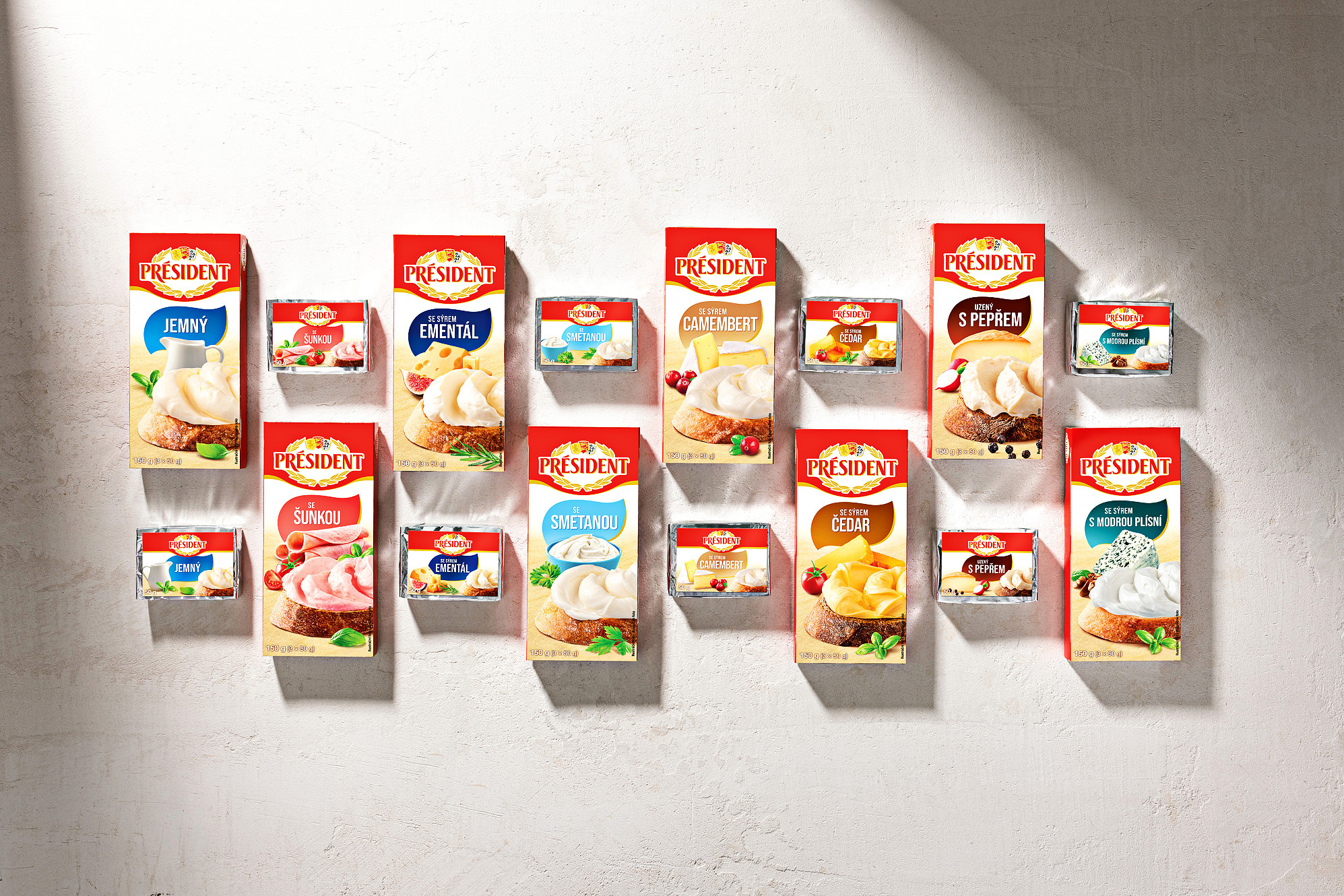 Připravili jsme kompletní vizuální sadu obalů pro řadu tavených sýrů značky Président. Projekt zahrnoval food styling, produktovou fotografii, grafický design a úpravu osmi hlavních designů obalů.