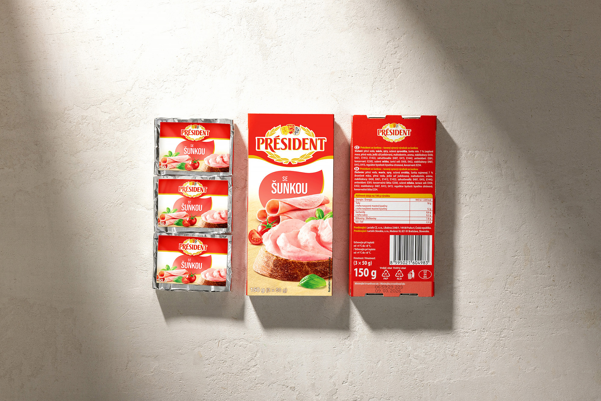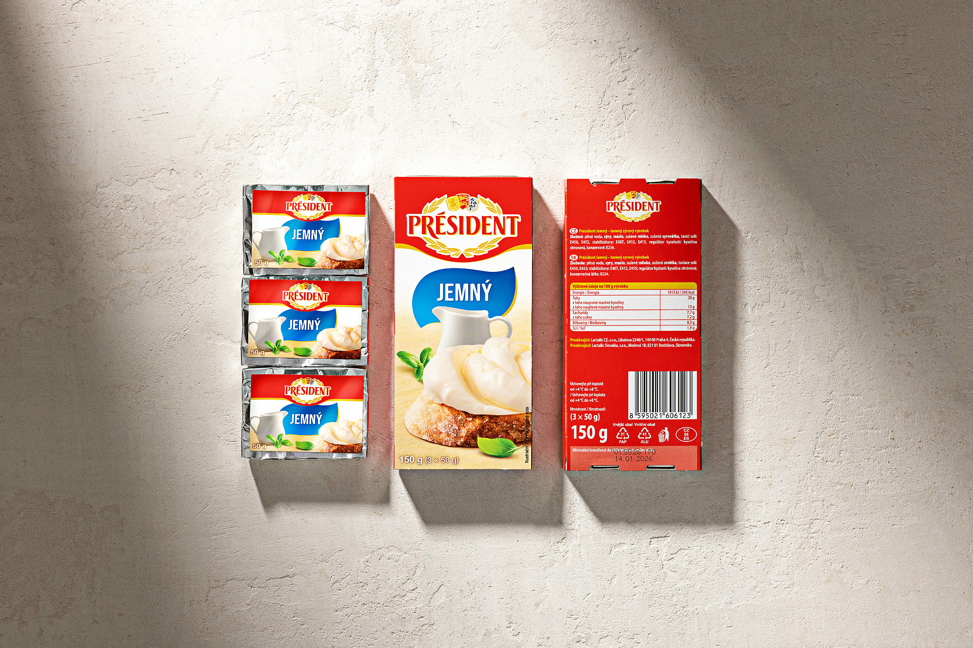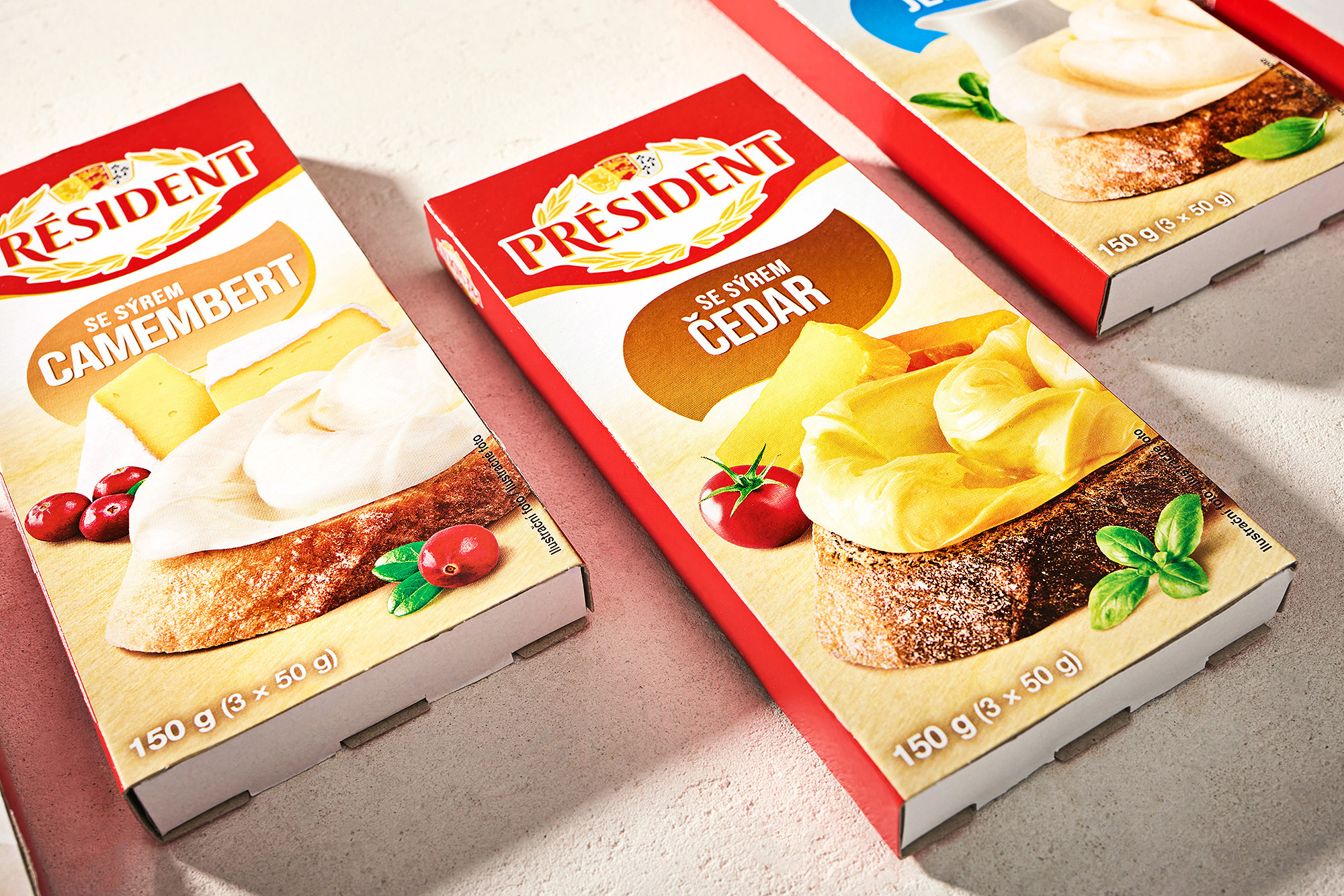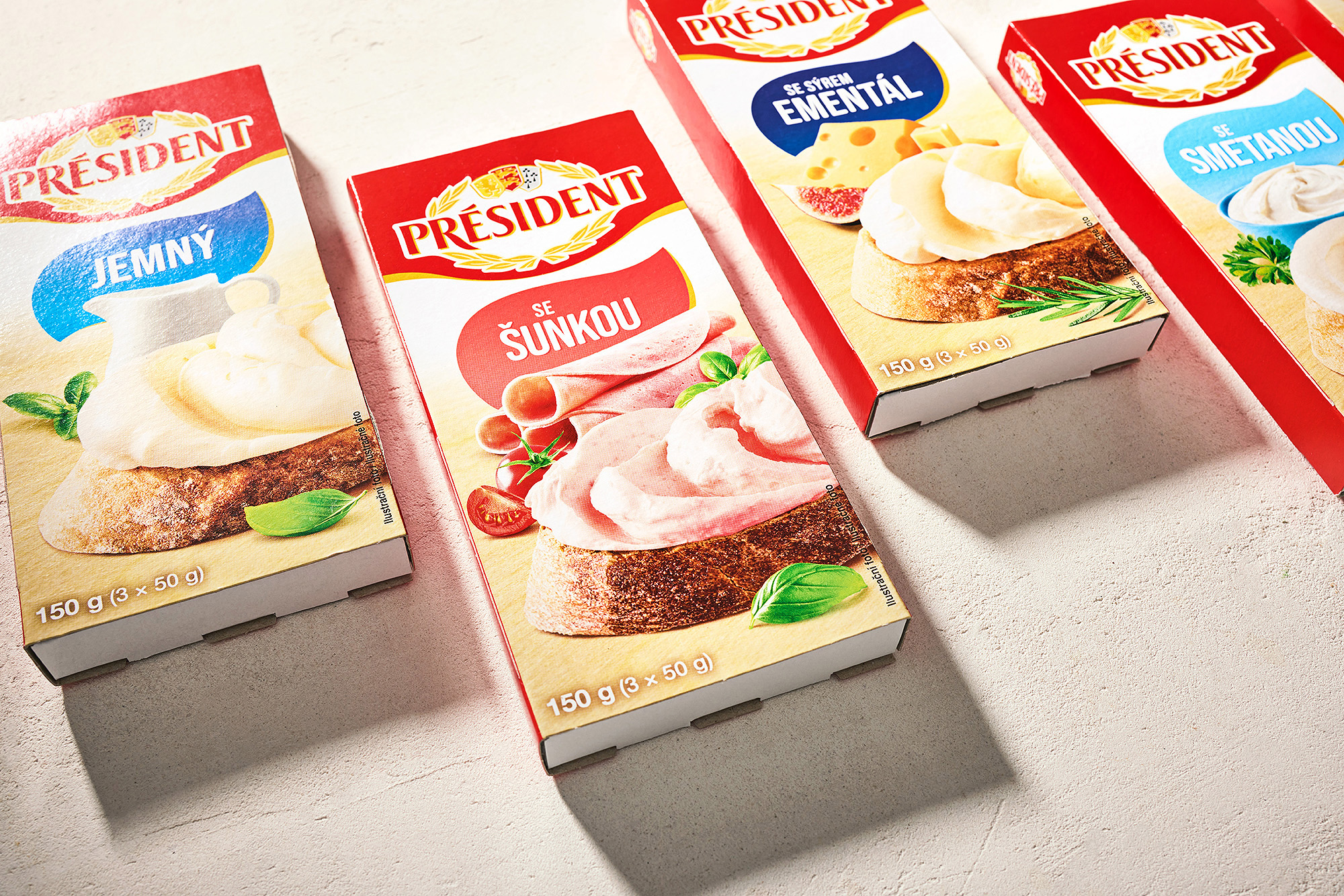Připravili jsme kompletní vizuální sadu obalů pro řadu tavených sýrů značky Président. Projekt zahrnoval food styling, produktovou fotografii, grafický design a úpravu osmi hlavních designů obalů.